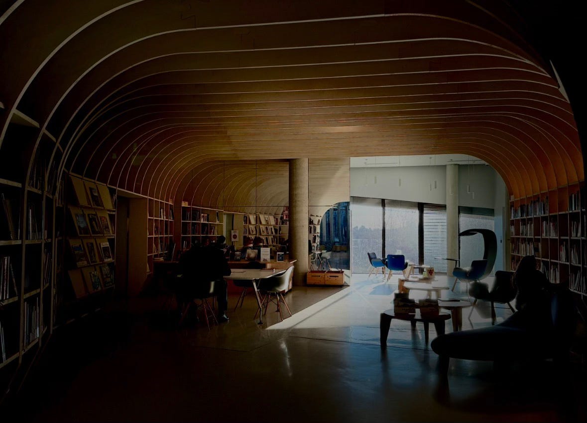 Notice the architecture…concentric rings drawing your eye toward light and open space. Structure and flow. Containment and possibility. The warm interior giving way to cool daylight beyond.
